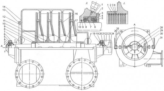 Компрессорный узел в сборе представляет собой собственно компрессор и электродвигатель, размещенные на одной фундаментной раме. Патрубки подачи и нагнетания присоединяются в одной плоскости. На входе и выходе в корпусе имеются спиралевидные камеры, улучшающие аэродинамические характеристики рабочего потока.